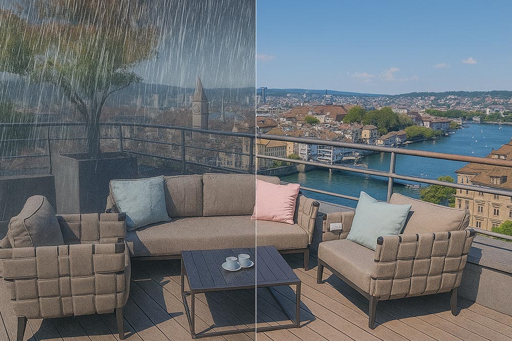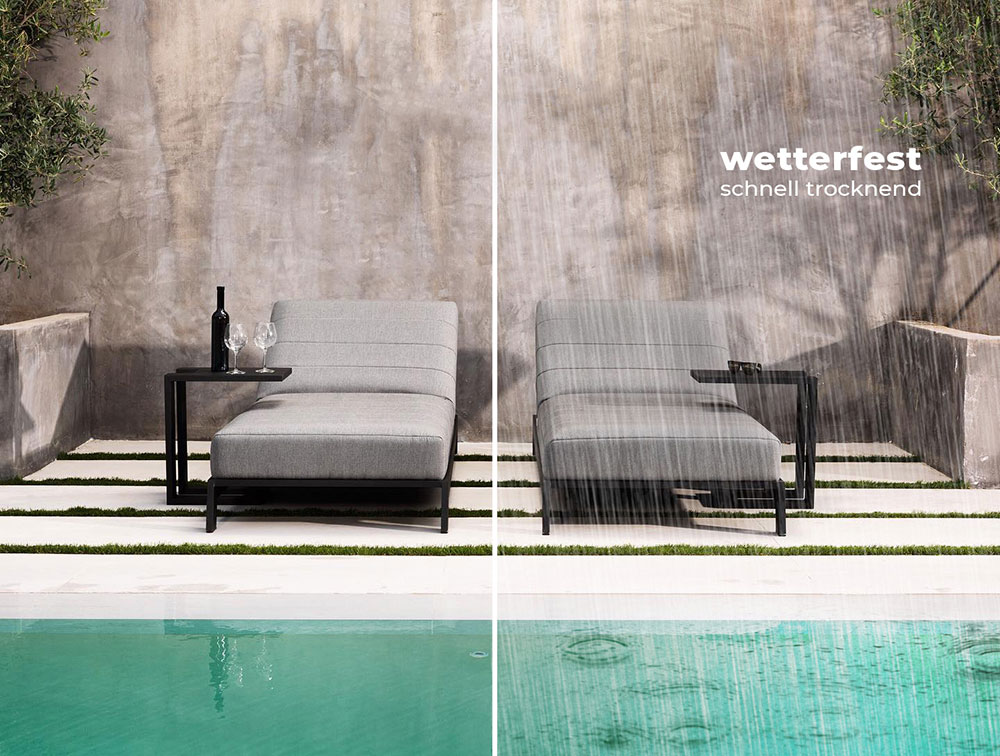 Sunbrella ist der hochwertigste Bezug für Outdoor Möbel und DIVANO LOUNGE der weltweit grösste Abnehmer von Sunbrella Bezug. Der Bezug ist 100 % durchgefärbt und bleicht auch nach Jahren nicht aus, er ist schmutz-und wasserabweisend, atmungsaktiv, schimmelbeständig und äusserst pflegeleicht.